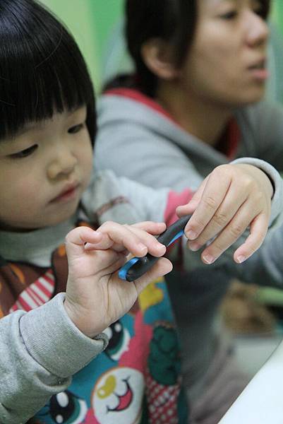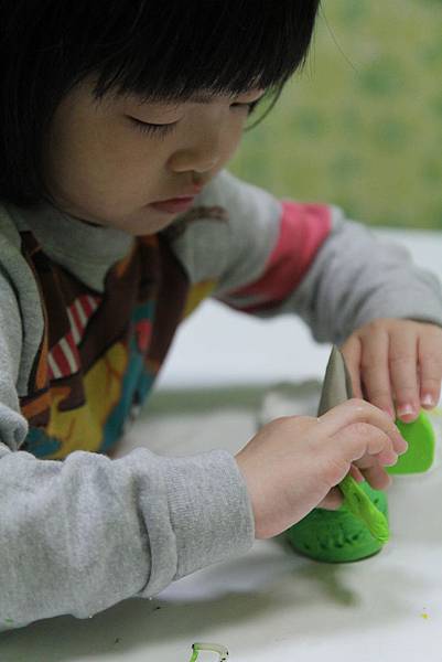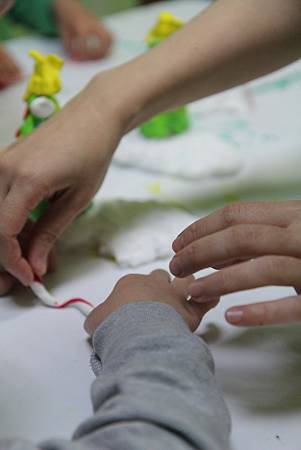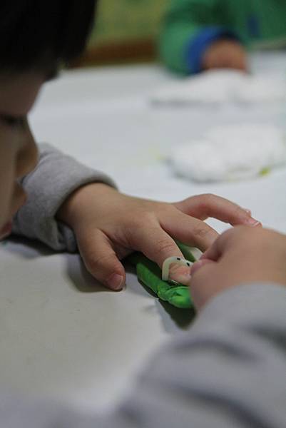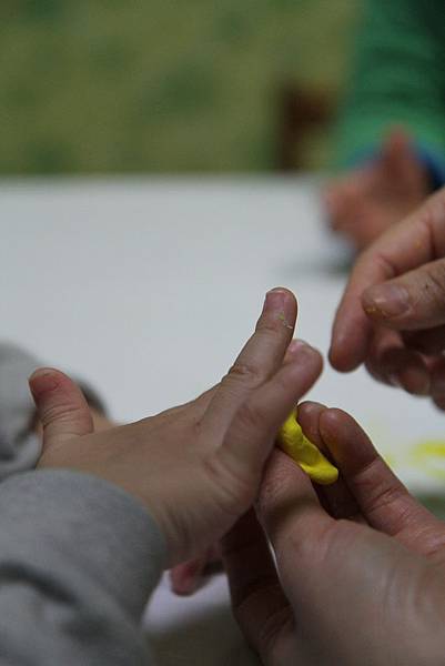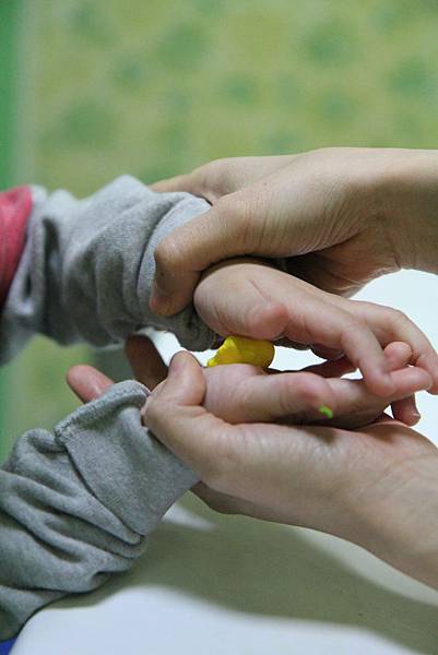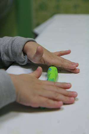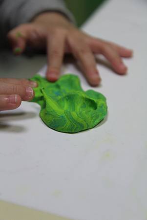老師希望孩子能將兩種顏色的黏土 搓揉製造出混色的效果