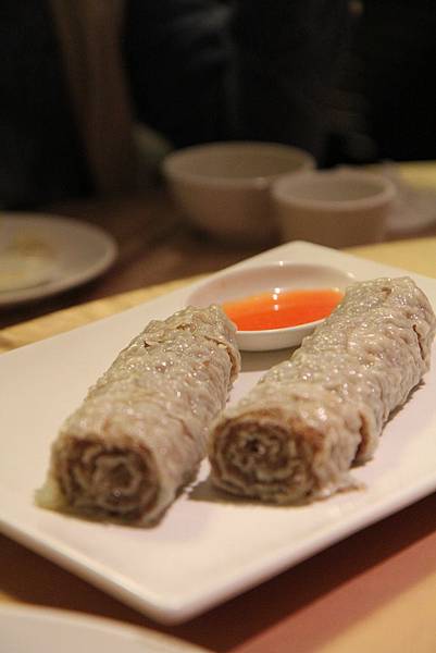 手工皮 有點類似餛飩皮那種Q彈~ 內餡是豬肉和冬粉 有點像千層麵一樣捲起來~
