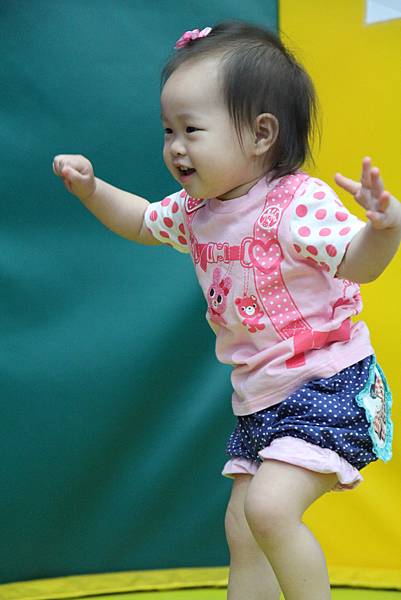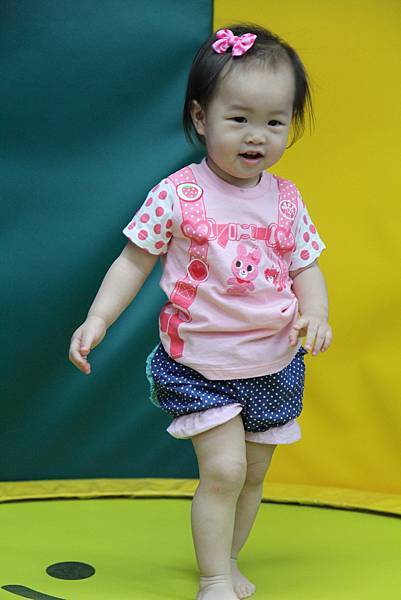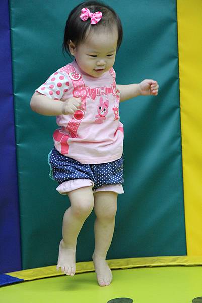 所以走完平衡木翻滾完 妹妹馬上衝去前面的跳跳床