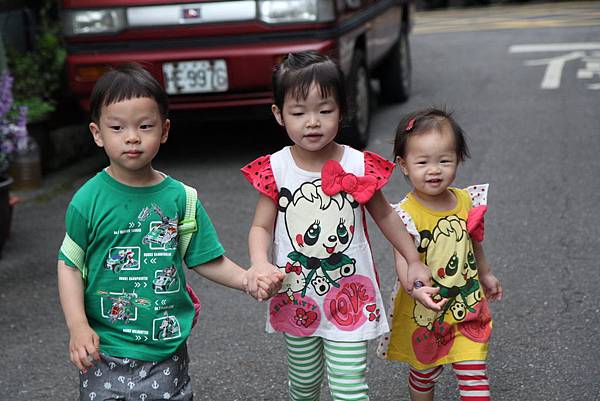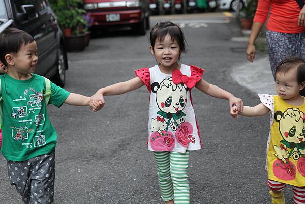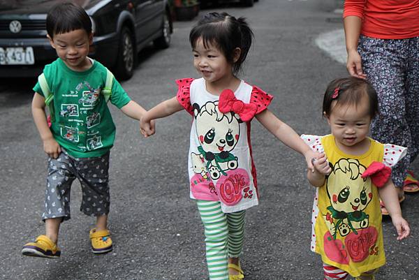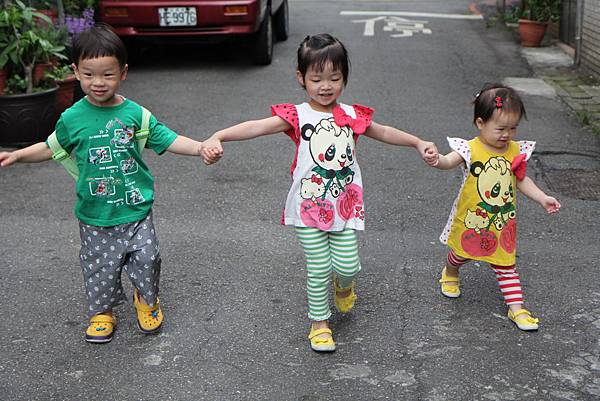 真的很難牽耶~ 各走各的 自己走都走不好了 何況還要三個牽在一起走