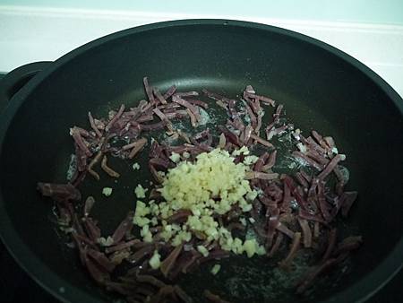 1. 先將肉絲放入鍋內 煸一下 到有點香氣加入蒜末 (後記: 其實肉可以再切細一點)