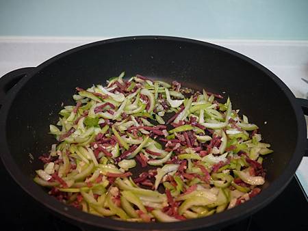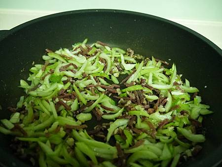 2. 加入青菜菜的梗拌炒