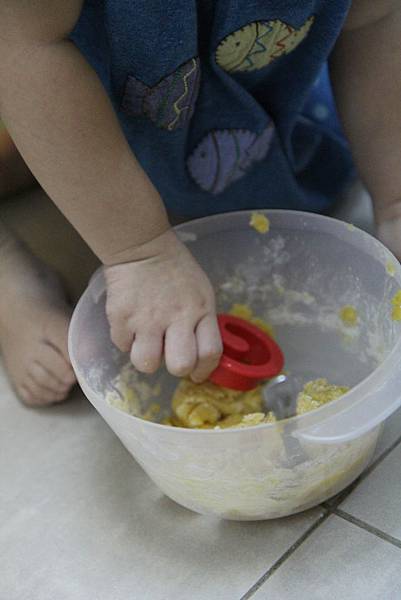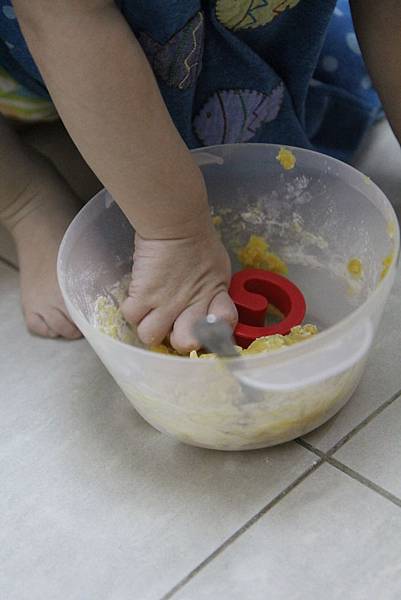 讓她們自己去感受麵粉與蛋的結合 由粉狀~ 到稍微固體~
