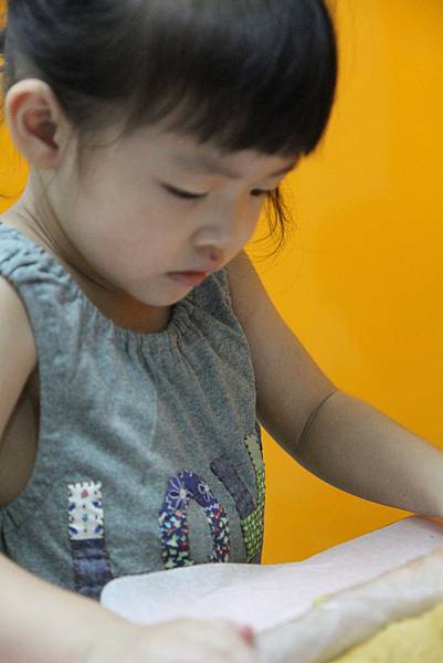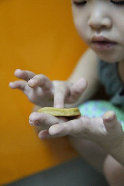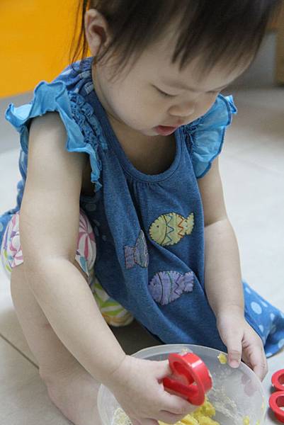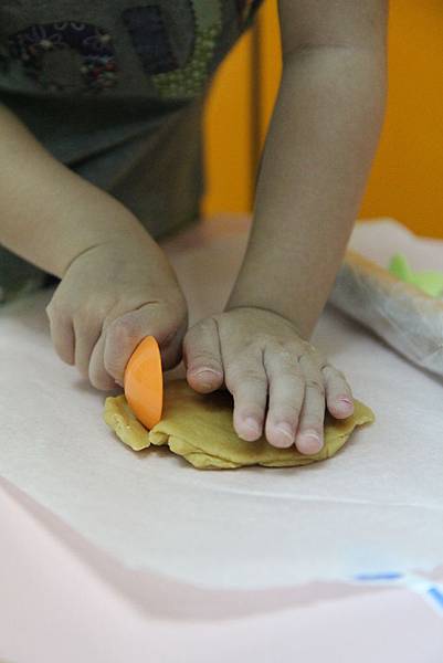 妹妹真的好好玩~ 她拿到模型 就直接壓在自己的麵糰上面~