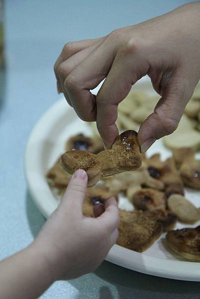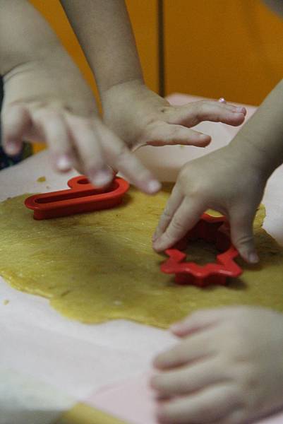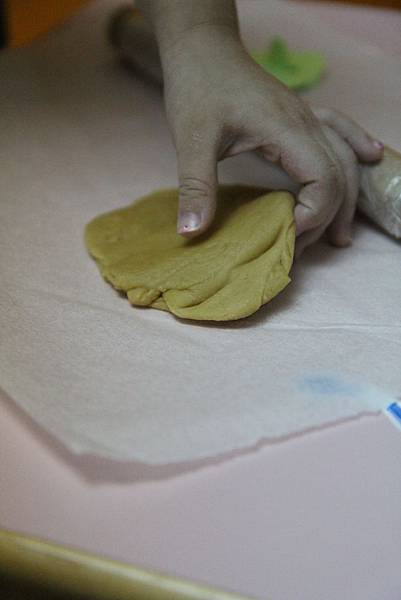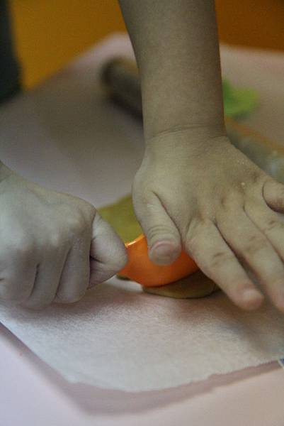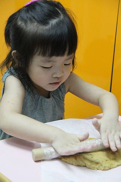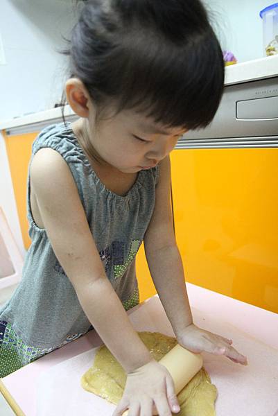 等妹妹壓膩了~ 再告訴她 其實 應該要桿麵糰 才能壓模的!! (妹妹的表情呆呆的~ 好像似懂非懂)
