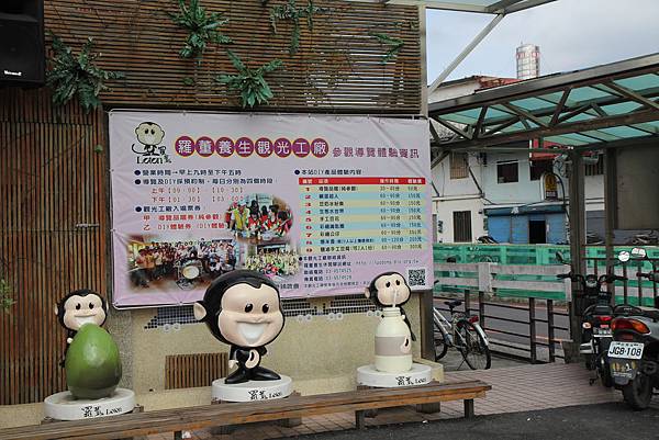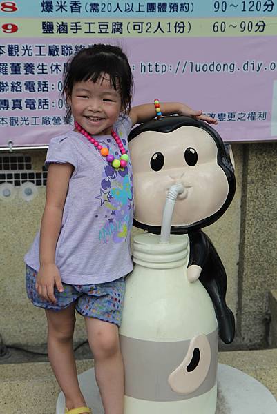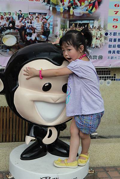 外頭就有一隻吉祥動物猴子 姊姊喜歡這隻喝豆漿的 興奮的爬上去要拍照